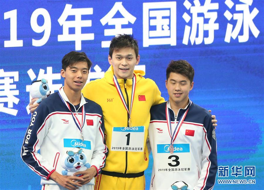 3月27日,冠军孙杨(中)、亚军季新杰(左)和季军程龙在颁奖仪式上。 当日,在青岛举行的2019年全国游泳冠军赛暨世锦赛选拔赛男子800米自由泳决赛中,浙江队选手孙杨以7分48秒03的成绩获得冠军。 新华社发(雒圆摄)