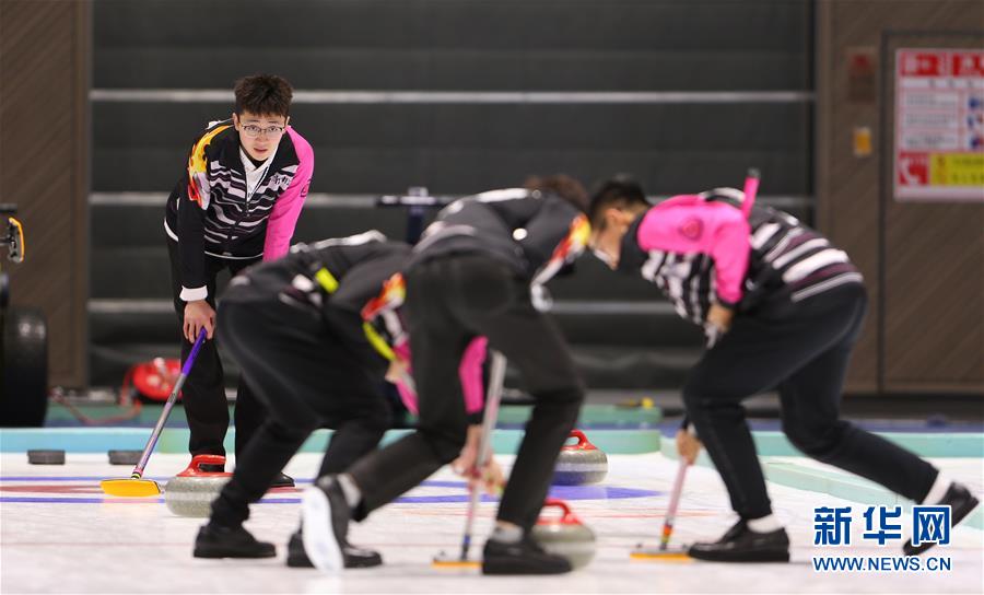 4月11日,哈尔滨二队选手孟天宇(左一)在男子组第四轮对阵哈尔滨五队的比赛中。最终,哈尔滨二队以1比7不敌哈尔滨五队。 当日,在北京首钢园运动中心冰壶馆举行的2018-2019年度全国冰壶冠军赛进入第二个比赛日。 新华社发(雒圆摄)