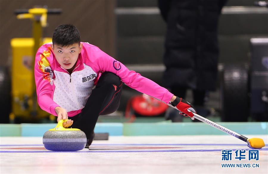 哈尔滨五队选手王金波在男子组第四轮对阵哈尔滨二队的比赛中掷壶。新华社发(雒圆摄)