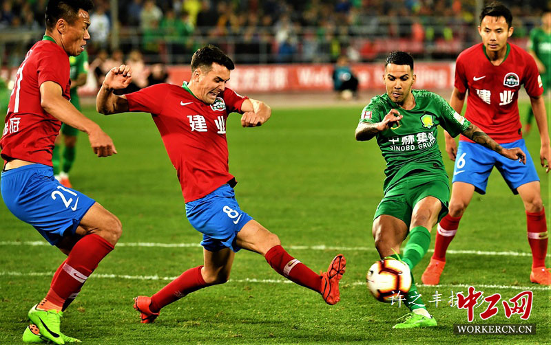 4月14日晚,2019赛季中超联赛第五轮比赛,北京中赫国安主场2比1战胜河南建业。比赛进行第52分钟,国安队进攻中建业后卫张文涛手球,主裁判在视频裁判提醒下判定点球,奥古斯托操刀命中。第68分钟,李可打入了归化球员在中超的首粒入球。第72分钟,建业队奥汉德扎点球破门。目前国安队取得开季5连胜独领积分榜首。图为双方的比赛瞬间。工人日报-中工网许之丰摄影报道