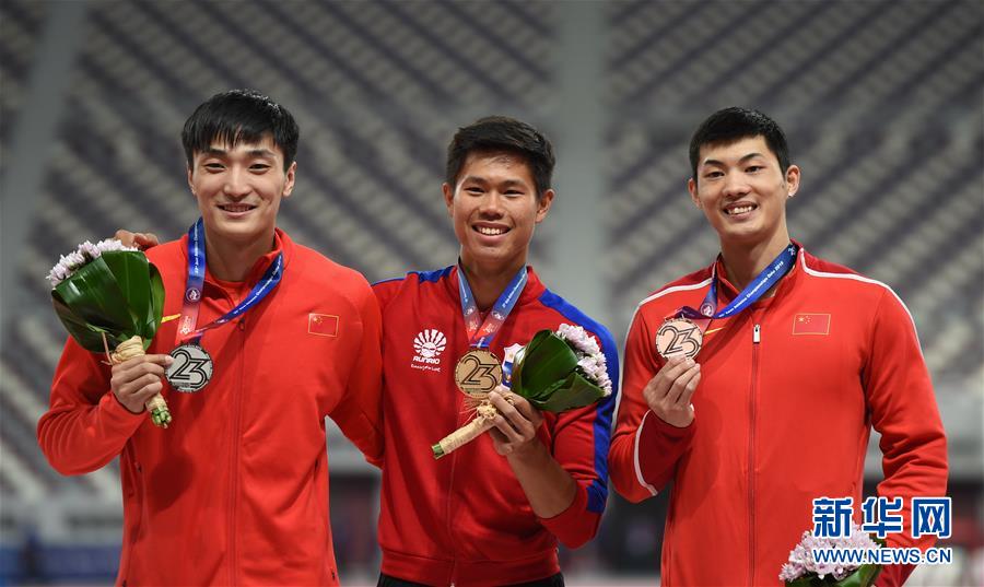 4月21日,冠军菲律宾选手埃内斯特(中)、亚军中国选手张伟(左)和季军中国选手黄博凯(右)在颁奖仪式上合影。 当日,在第23届亚洲田径锦标赛男子撑杆跳高决赛中,菲律宾选手埃内斯特以5米71的成绩获得冠军,中国选手张伟和黄博凯均以5米66的成绩获得亚军和季军。 新华社记者邬惠我摄