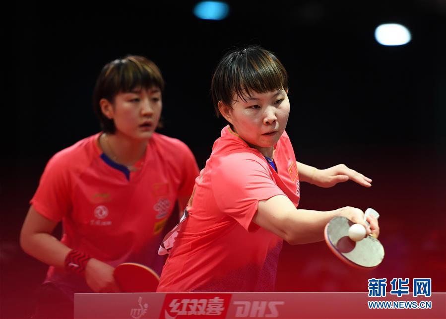 4月24日,陈梦/朱雨玲(右)在比赛中回球。 当日,在匈牙利布达佩斯举行的2019世界乒乓球锦标赛女子双打第三轮比赛中,中国组合陈梦/朱雨玲以4比2战胜跨国组合李倩(波兰)/李洁(荷兰),晋级八强。 新华社记者逯阳摄