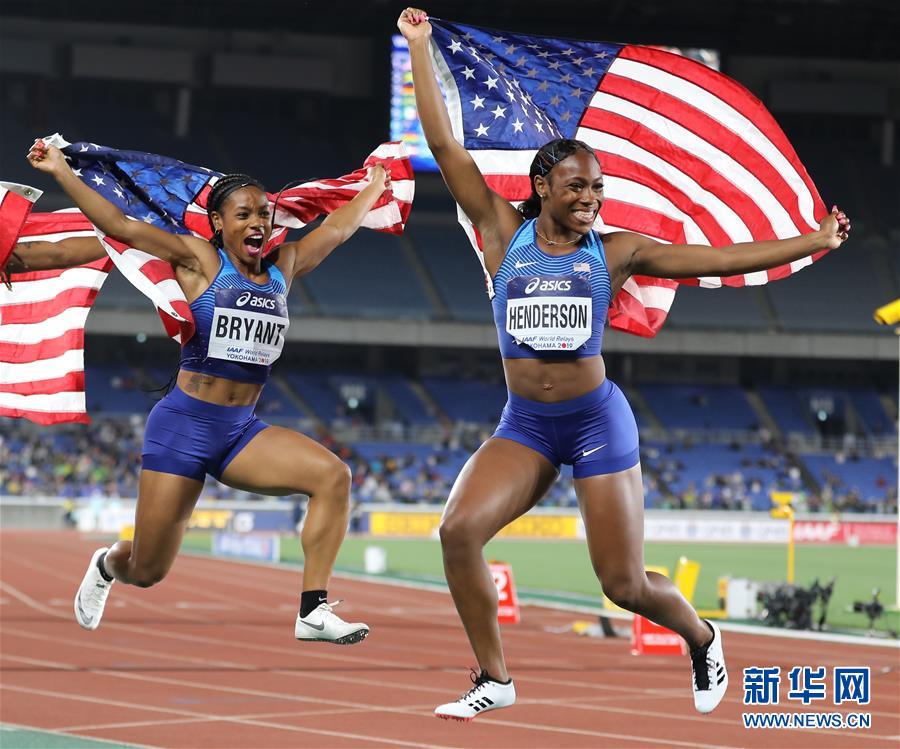 5月12日,美国队选手布莱恩特(左)与亨德森在比赛后庆祝。 当日,在日本横滨举行的世界接力赛女子4X100米接力决赛中,美国队以43秒27的成绩夺得冠军。 新华社记者杜潇逸摄