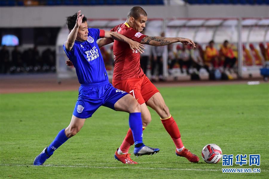 长春亚泰队球员莫利德斯(右)在比赛中突破。 当日,在2019赛季中甲联赛第九轮比赛中,长春亚泰队主场以3比2战胜石家庄永昌队。