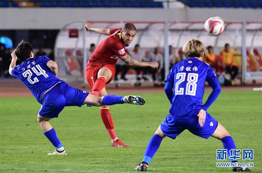 长春亚泰队球员莫利德斯(中)在比赛中射门。 新华社记者林宏摄
