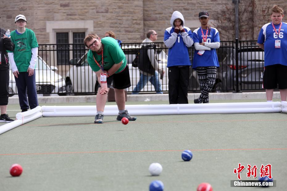 当地时间5月16日,在多伦多举行的加拿大安大略省特殊奥林匹克青年邀请赛最后一个比赛日的室外地滚球比赛中,参赛选手正在抛球。这一运动会吸引了来自北美、加勒比等地区的2500名运动员和教练员参加田径、室外地滚球、室内地板曲棍球、篮球和足球五个大项的赛事。中新社记者 余瑞冬 摄