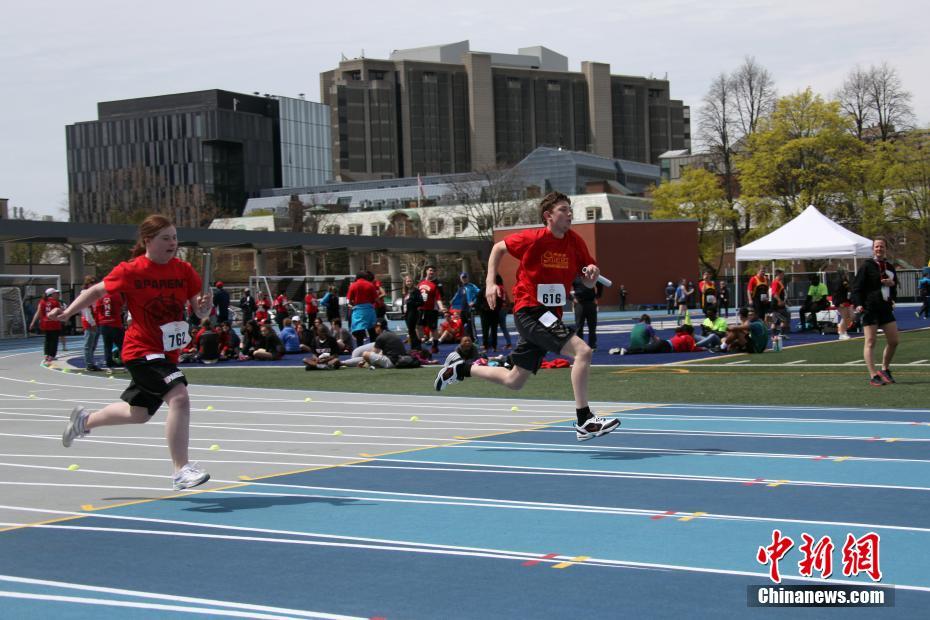 当地时间5月16日,在多伦多举行的加拿大安大略省特殊奥林匹克青年邀请赛最后一个比赛日的田径赛场上,不同性别的选手在接力跑赛道上展开角逐。这一运动会吸引了来自北美、加勒比等地区的2500名运动员和教练员参加田径、室外地滚球、室内地板曲棍球、篮球和足球五个大项的赛事。中新社记者 余瑞冬 摄
