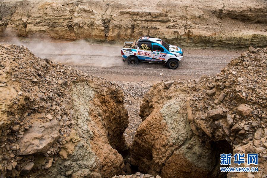5月20日,龙行天下车队车手王翔、领航员杨涛驾驶赛车通过干涸的河床。 当日,2019年环塔拉力赛超级短道排位赛开始,赛段全长约58.5公里。今天的比赛成绩决定着明日比赛的发车顺序。 新华社记者江文耀摄