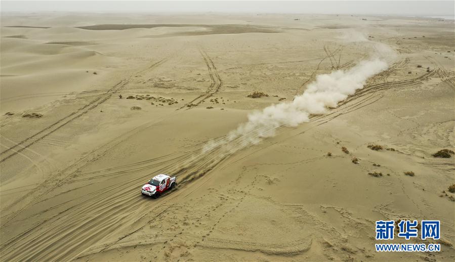 5月20日,八一钢铁长城润滑油车队车手连俊涛、领航员林杰驾驶赛车疾驰在赛道上(无人机拍摄)。 当日,2019年环塔拉力赛超级短道排位赛开始,赛段全长约58.5公里。今天的比赛成绩决定着明日比赛的发车顺序。 新华社记者胡虎虎摄