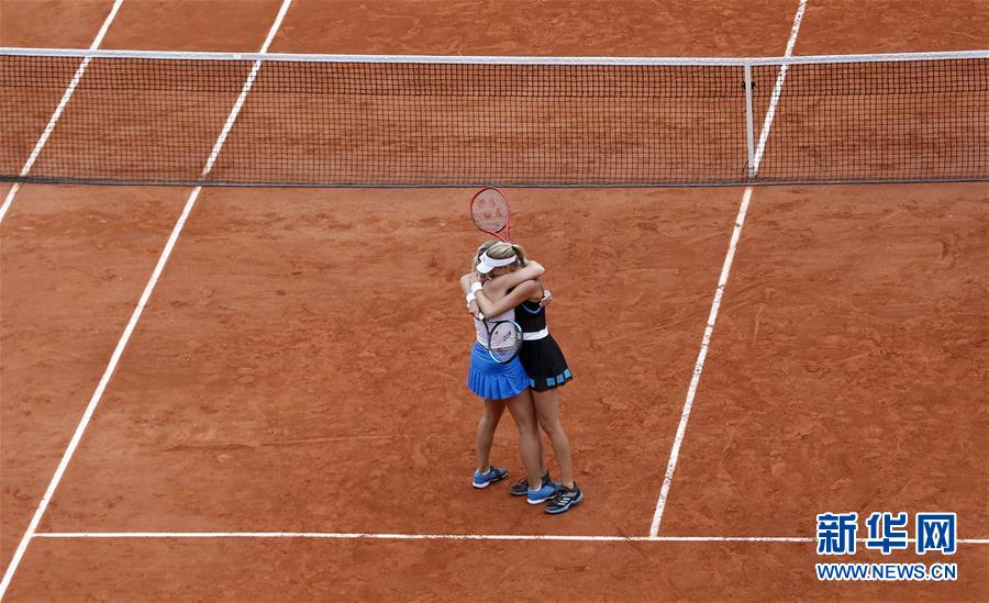 6月9日,巴博什/姆拉德诺维奇(右)在获胜后庆祝。 当日,在法国巴黎罗兰·加洛斯球场进行的2019年法国网球公开赛女双决赛中,匈牙利选手巴博什与法国选手姆拉德诺维奇以2比0战胜中国选手段莹莹/郑赛赛,获得冠军。 新华社记者韩岩摄