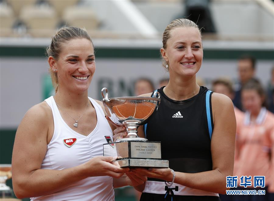6月9日,巴博什/姆拉德诺维奇(右)在颁奖仪式上。 当日,在法国巴黎罗兰·加洛斯球场进行的2019年法国网球公开赛女双决赛中,匈牙利选手巴博什与法国选手姆拉德诺维奇以2比0战胜中国选手段莹莹/郑赛赛,获得冠军。 新华社记者韩岩摄