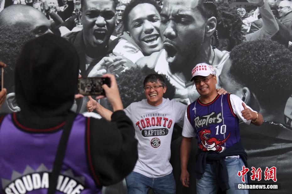 当地时间6月10日,美国职业篮球联赛(NBA)2018-2019赛季总决赛在加拿大多伦多迎来第五回合比赛。在此前四个回合的较量中,猛龙队以三胜一负的战绩率先取得赛点。图为开赛前,多伦多猛龙队球迷在赛场外球队明星的大幅照片下合影。中新社记者 余瑞冬 摄