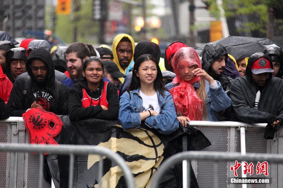 当地时间6月10日,美国职业篮球联赛(NBA)2018-2019赛季总决赛在加拿大多伦多迎来第五回合比赛。在此前四个回合的较量中,猛龙队以三胜一负的战绩率先取得赛点。图为大批多伦多猛龙队球迷在球场外冒雨等待观看户外大屏直播,为猛龙队助威。中新社记者 余瑞冬 摄
