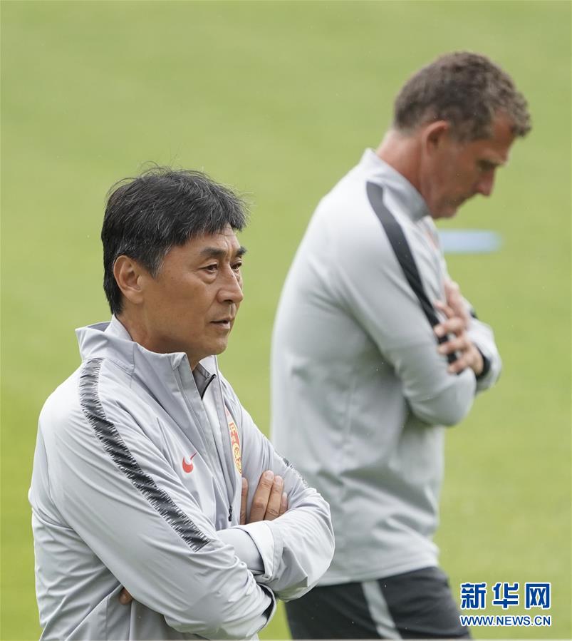 中国女足主教练贾秀全(左)观察队员训练。 当日,中国女足队员在巴黎训练,备战2019年国际足联女足世界杯B组小组赛与南非队的比赛。