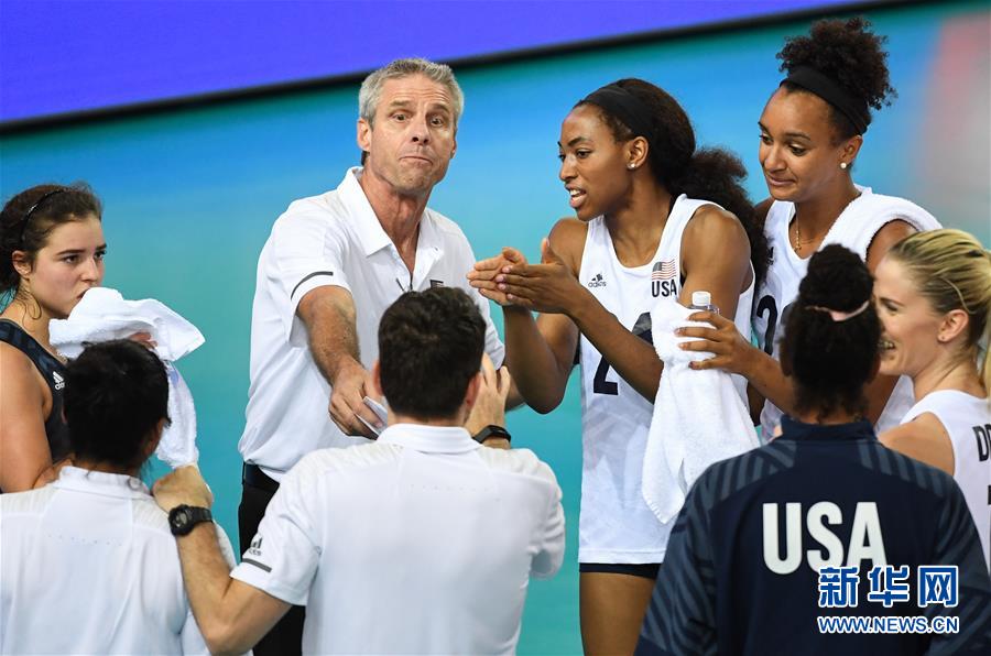 6月12日,美国队主教练基拉里(上左)在比赛间隙与队员交流。 当日,在2019年世界女排联赛江门站的比赛中,美国队以3比1战胜波兰队。 新华社记者邓华摄