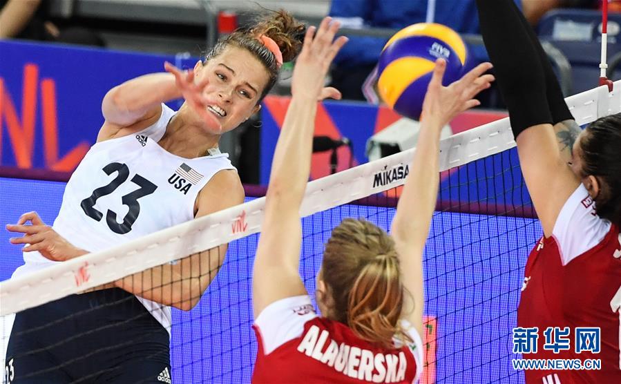 6月12日,美国队球员鲁滨逊(左)在比赛中扣球。 当日,在2019年世界女排联赛江门站的比赛中,美国队以3比1战胜波兰队。 新华社记者邓华摄