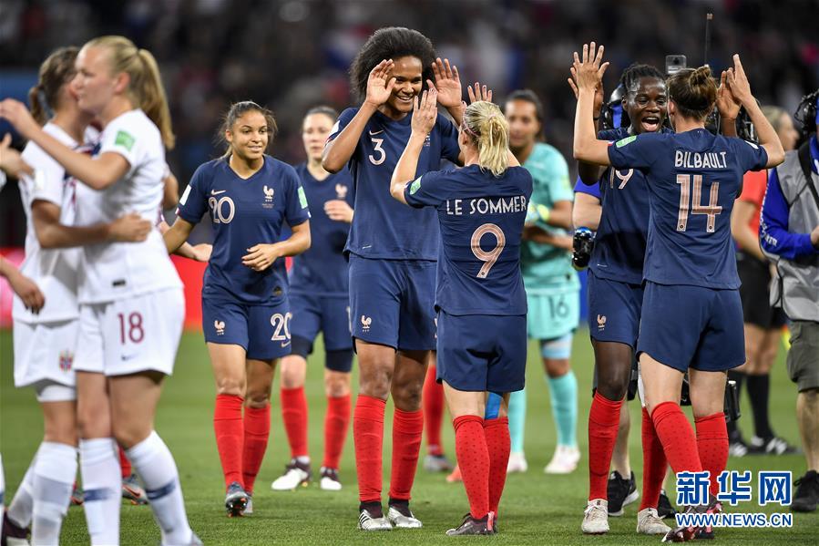 6月12日,法国队球员在比赛后庆祝胜利。 当日,在法国尼斯举行的2019年国际足联女足世界杯A组小组赛中,法国队以2比1战胜挪威队。 新华社记者陈益宸摄