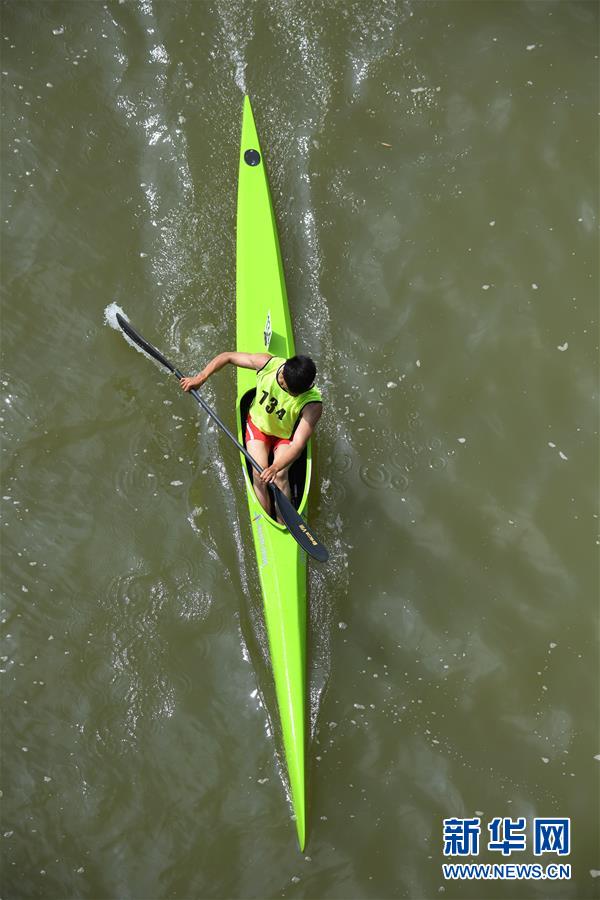 6月13日,陕西选手曹怀钰在男子乙组单人皮艇4000米比赛中。 当日,2019全国皮划艇静水青年锦标赛在陕西省汉中市开赛。本次赛事分为男子U19、男子U17、女子U19、女子U17四个组别,设置单人皮艇、单人划艇、双人皮艇、双人划艇、四人皮艇和单人桨板等六个单项竞赛项目,吸引了全国近400名运动员参赛。 新华社记者李一博摄