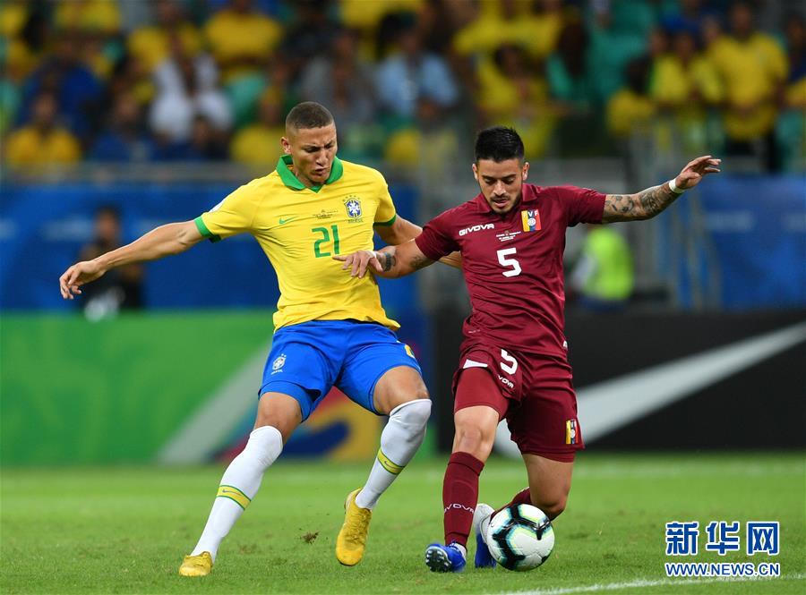 6月18日,巴西队球员理查尔里森(左)与委内瑞拉队球员儒尼奥尔·莫莱诺在比赛中拼抢。 当日,在巴西萨尔瓦多市举行的2019年美洲杯足球赛小组赛A组比赛中,委内瑞拉队以0比0逼平东道主巴西队。 新华社记者辛悦卫摄