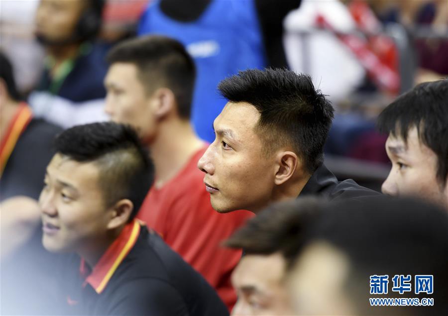 6月19日,中国队球员易建联(中)在比赛中观战。 当日,在2019年中澳国际男篮对抗赛青岛站比赛中,中国队以89比77战胜澳大利亚NBL联队。 新华社记者李紫恒摄