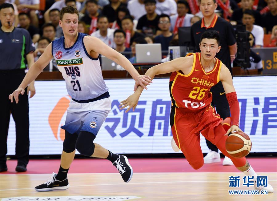 6月19日,中国队球员陈林坚(右)在比赛中带球突破。 当日,在2019年中澳国际男篮对抗赛青岛站比赛中,中国队以89比77战胜澳大利亚NBL联队。 新华社记者李紫恒摄