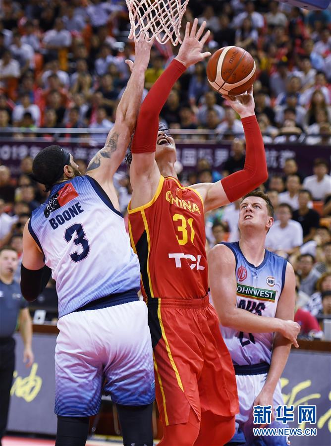6月19日,中国队球员王哲林(中)在比赛中上篮受阻。 当日,在2019年中澳国际男篮对抗赛青岛站比赛中,中国队以89比77战胜澳大利亚NBL联队。 新华社记者李紫恒摄