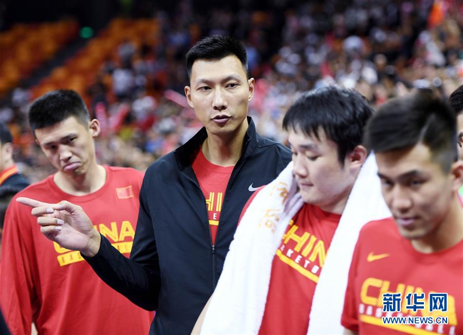 6月19日,中国队球员易建联(左二)与队友交流。 当日,在2019年中澳国际男篮对抗赛青岛站比赛中,中国队以89比77战胜澳大利亚NBL联队。 新华社记者李紫恒摄