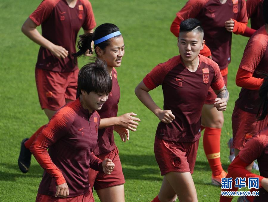 6月23日,中国队球员王霜、李佳悦、李影(从左到右)在训练中热身。 当日,中国女足队员在法国蒙彼利埃训练,备战2019年国际足联女足世界杯16强赛,中国队将于北京时间6月26日零时迎战意大利队。 新华社记者丁旭摄