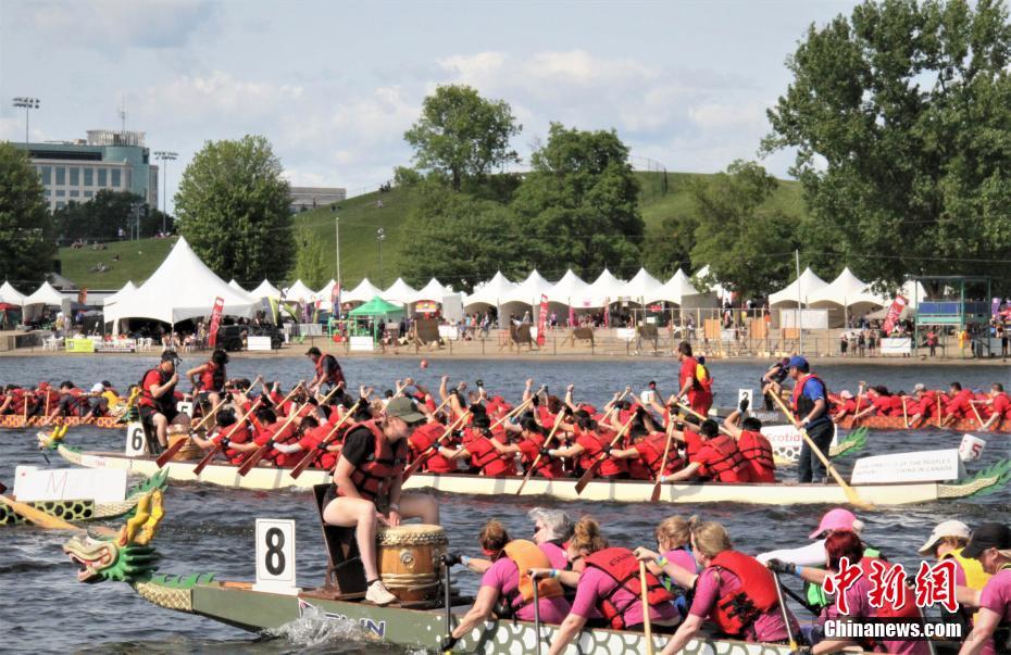当地时间6月21日至23日,2019年渥太华龙舟节在加拿大首都渥太华的丽都运河上举行。中国驻加拿大大使馆组队连续第三年组队参赛。约200支龙舟队参加了本届赛事。图为中国驻加使馆的“极地熊猫”队(6号龙舟)队员在比赛中奋力挥桨。中国驻加拿大大使馆供图