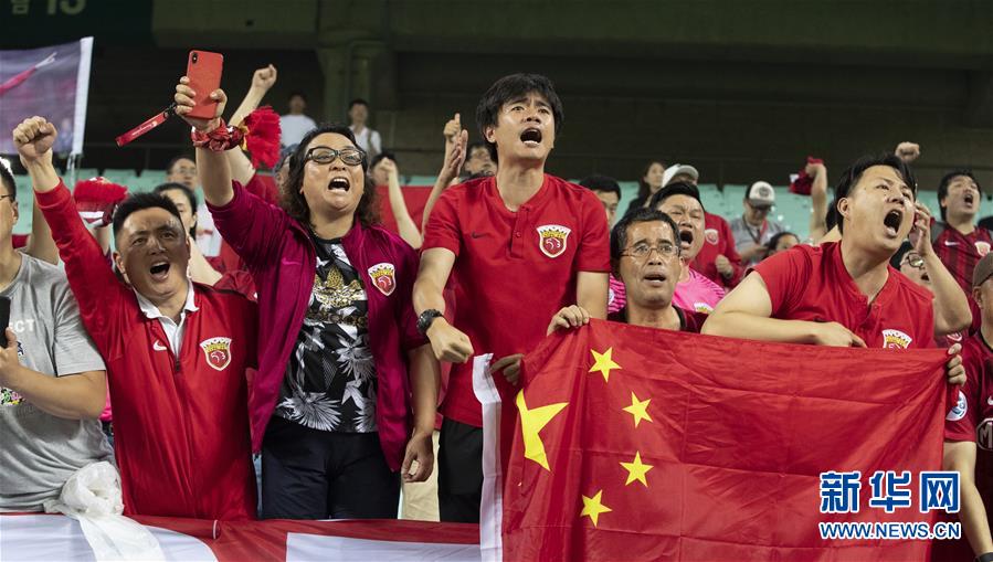 6月26日,上海上港队球迷在看台欢呼。 当日,在韩国全州举行的2019亚洲足球冠军联赛八分之一决赛第二回合比赛中,中超上海上港队客场对阵韩国全北现代队。两队经90分钟战成1比1,总比分2比2,经加时赛仍未决出胜负。最终,上海上港队在点球大战中以5比3战胜对手,以总比分7比5战胜全北现代队,晋级八强。 新华社发(李相浩摄)