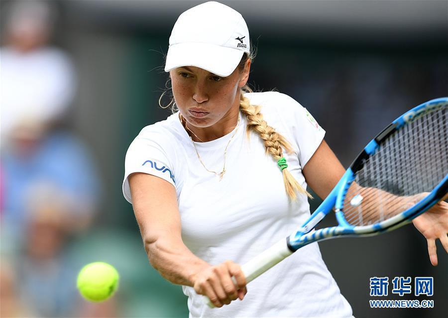 7月1日,普丁塞娃在比赛中回球。 当日,在英国伦敦举行的2019温布尔登网球公开赛女单第一轮比赛中,日本选手大坂直美以0比2不敌哈萨克斯坦选手普丁塞娃,无缘下一轮。 新华社记者逯阳摄