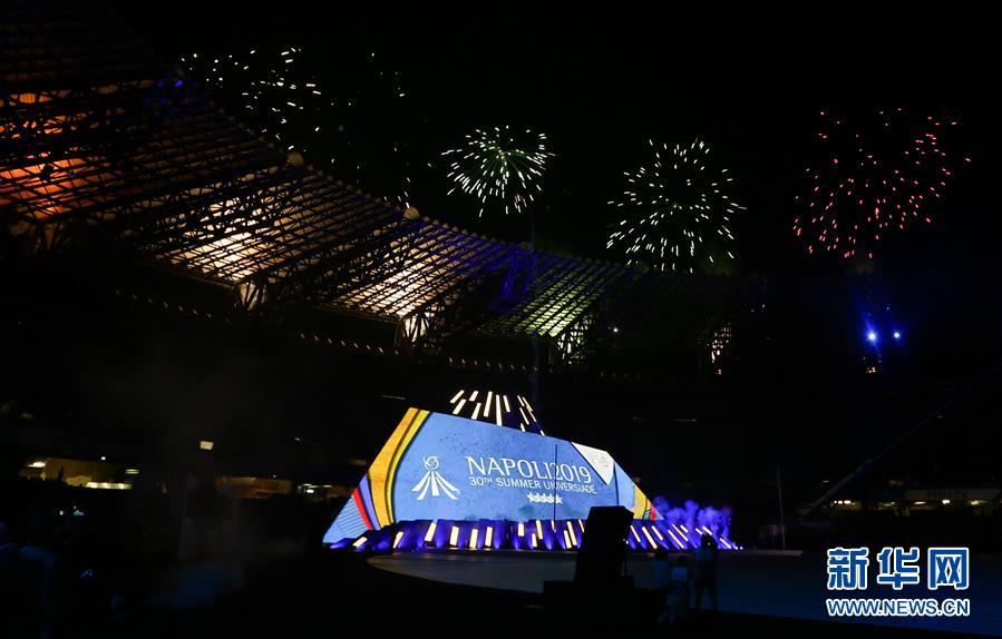 7月3日,开幕式现场烟花绽放。 当日,第30届世界大学生夏季运动会在意大利那不勒斯开幕。 新华社记者郑焕松摄