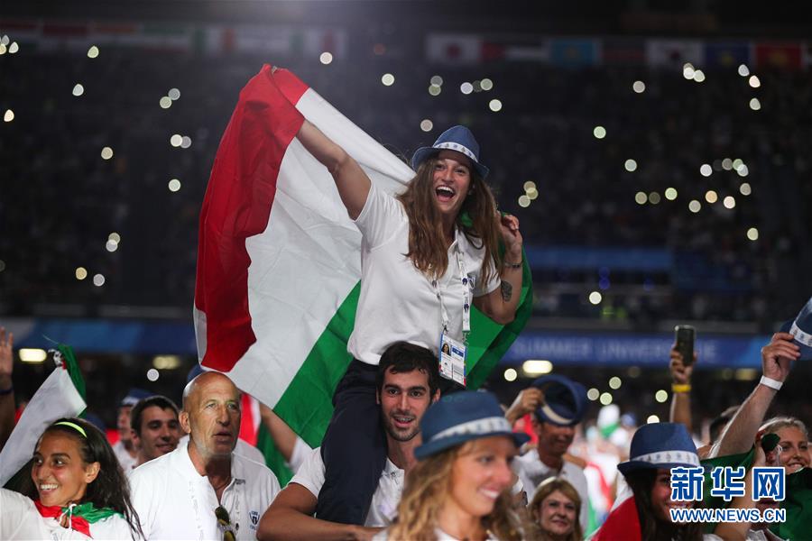 7月3日,东道主意大利大学生体育代表团在开幕式上入场。 当日,第30届世界大学生夏季运动会在意大利那不勒斯开幕。 新华社记者郑焕松摄