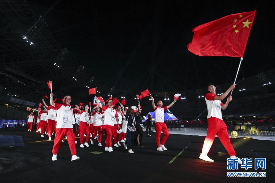 7月3日,中国大学生体育代表团在开幕式上入场。 当日,第30届世界大学生夏季运动会在意大利那不勒斯开幕。