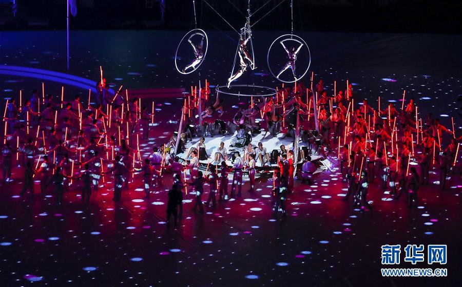 7月3日,演员在开幕式上表演。 当日,第30届世界大学生夏季运动会在意大利那不勒斯开幕。 新华社记者单宇琦摄