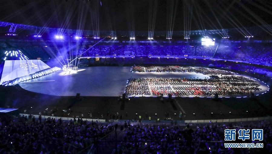 7月3日,演员在开幕式上表演。 当日,第30届世界大学生夏季运动会在意大利那不勒斯开幕。 新华社记者单宇琦摄