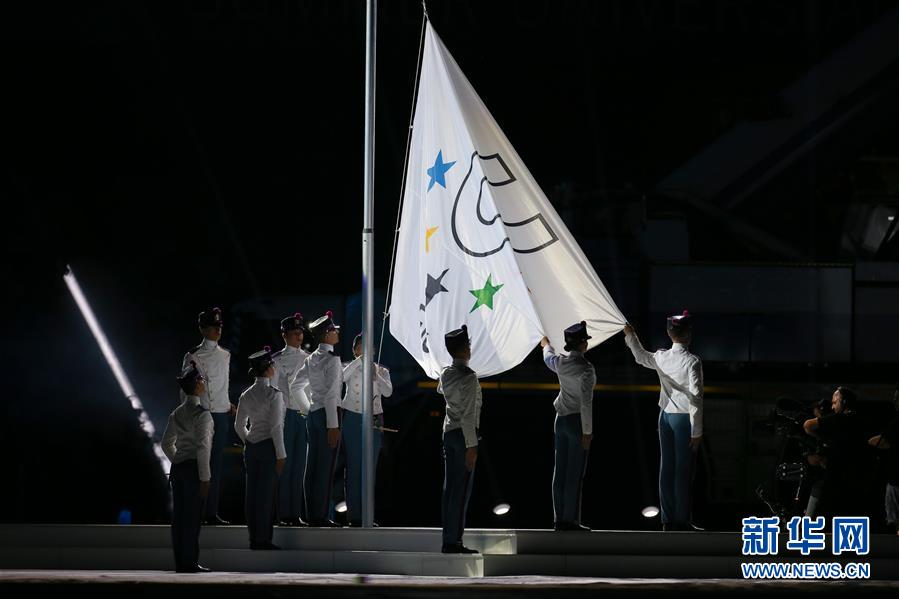 7月3日,旗手升起世界大学生体育联合会旗帜。 当日,第30届世界大学生夏季运动会在意大利那不勒斯开幕。 新华社记者郑焕松摄