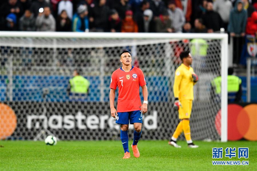 7月3日,智利队球员桑切斯(前)在比赛中。 当日,在巴西阿雷格里港举行的2019美洲杯半决赛中,秘鲁队以3比0淘汰智利队,晋级决赛。 新华社记者辛悦卫摄