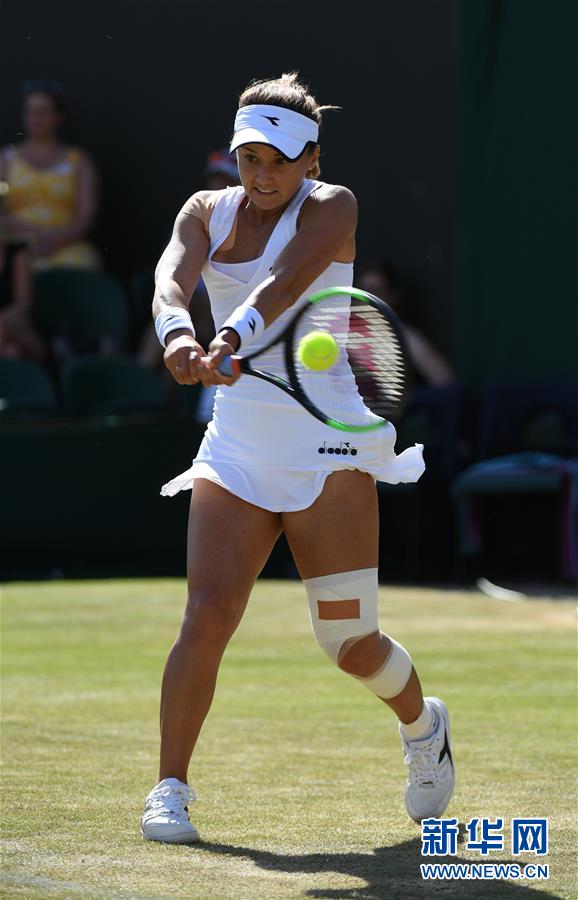 7月4日,戴维斯在比赛中回球。 当日,在英国伦敦举行的2019温布尔登网球公开赛女单第二轮比赛中,卫冕冠军、德国选手科贝尔以1比2不敌美国选手戴维斯,无缘下一轮。 新华社记者逯阳摄