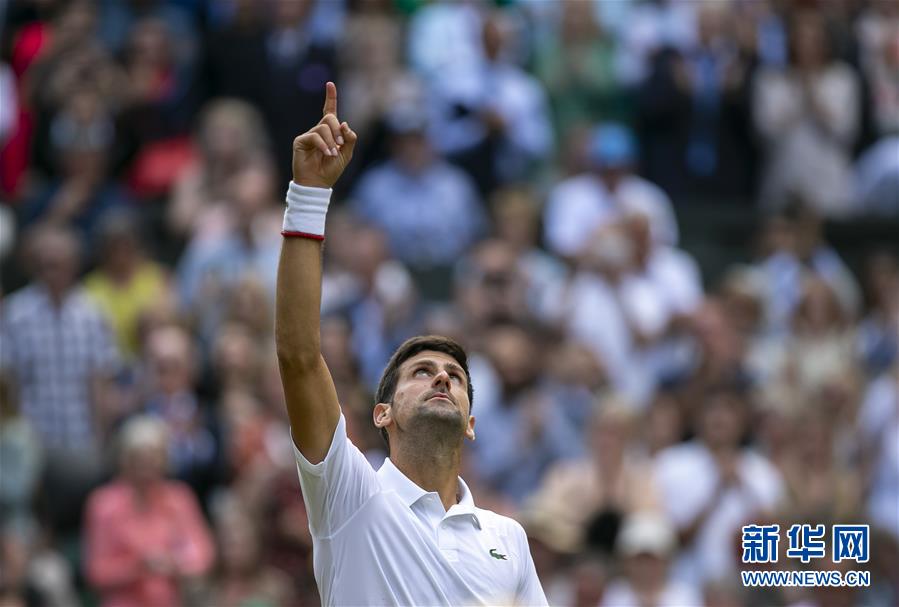 7月14日,焦科维奇在获胜后庆祝。 当日,在英国伦敦举行的2019温布尔登网球公开赛男单决赛中,塞尔维亚选手焦科维奇以3比2战胜瑞士选手费德勒,夺得冠军。 新华社记者 韩岩 摄