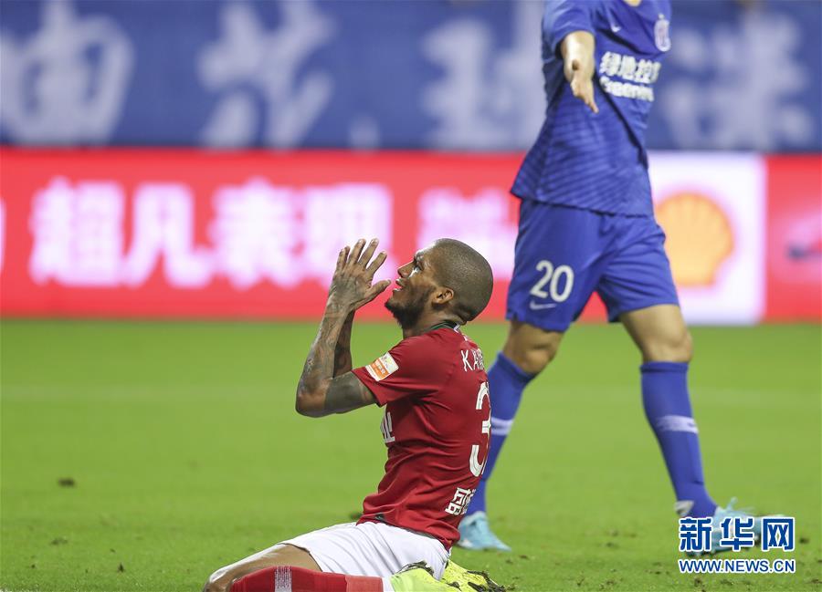 7月16日,河南建业队球员卡兰加(前)在比赛中。 当日,在2019赛季中超联赛第18轮比赛中,上海绿地申花队主场以3比2战胜河南建业队。 新华社记者丁汀摄