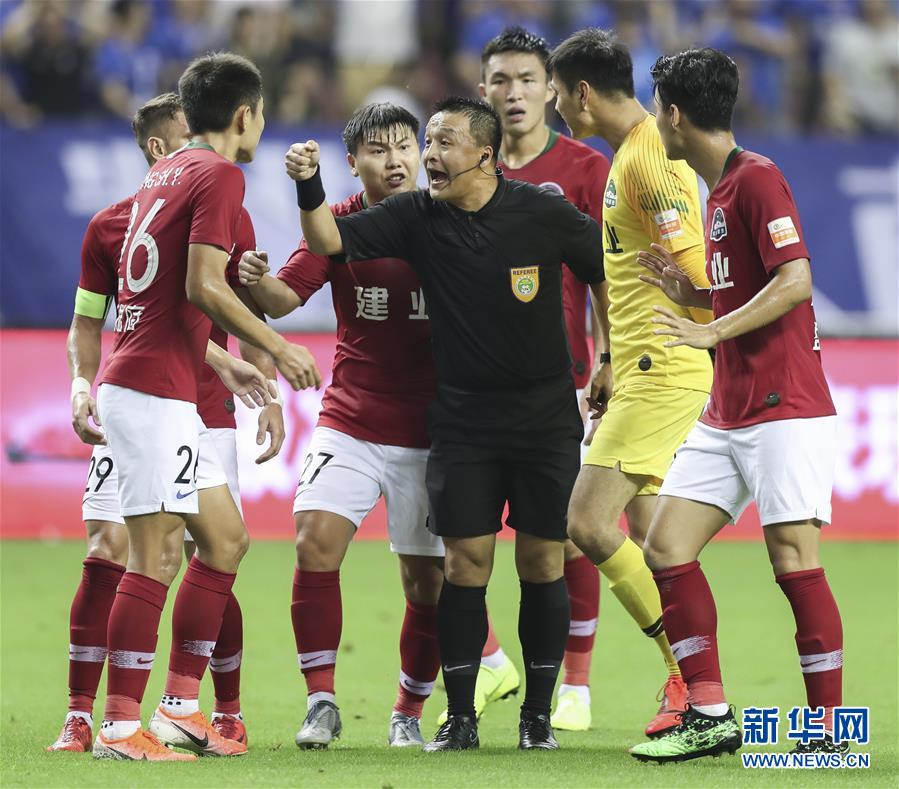 7月16日,主裁判石祯禄(中)与河南建业队球员交流。 当日,在2019赛季中超联赛第18轮比赛中,上海绿地申花队主场以3比2战胜河南建业队。 新华社记者丁汀摄
