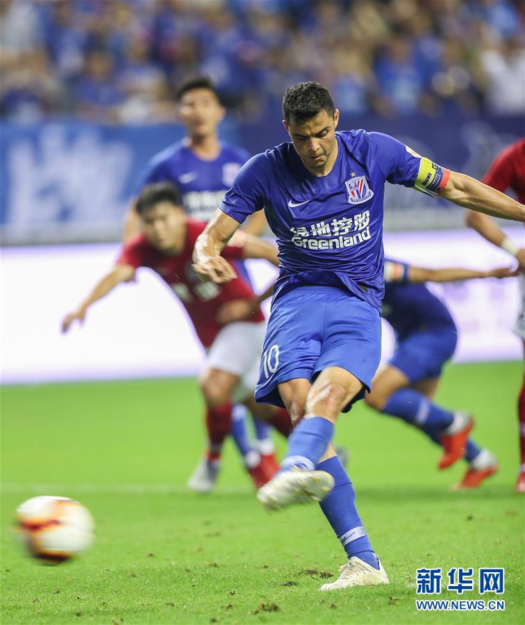 7月16日,上海绿地申花队球员莫雷诺(前)在比赛中主罚点球。 当日,在2019赛季中超联赛第18轮比赛中,上海绿地申花队主场以3比2战胜河南建业队。 新华社记者丁汀摄