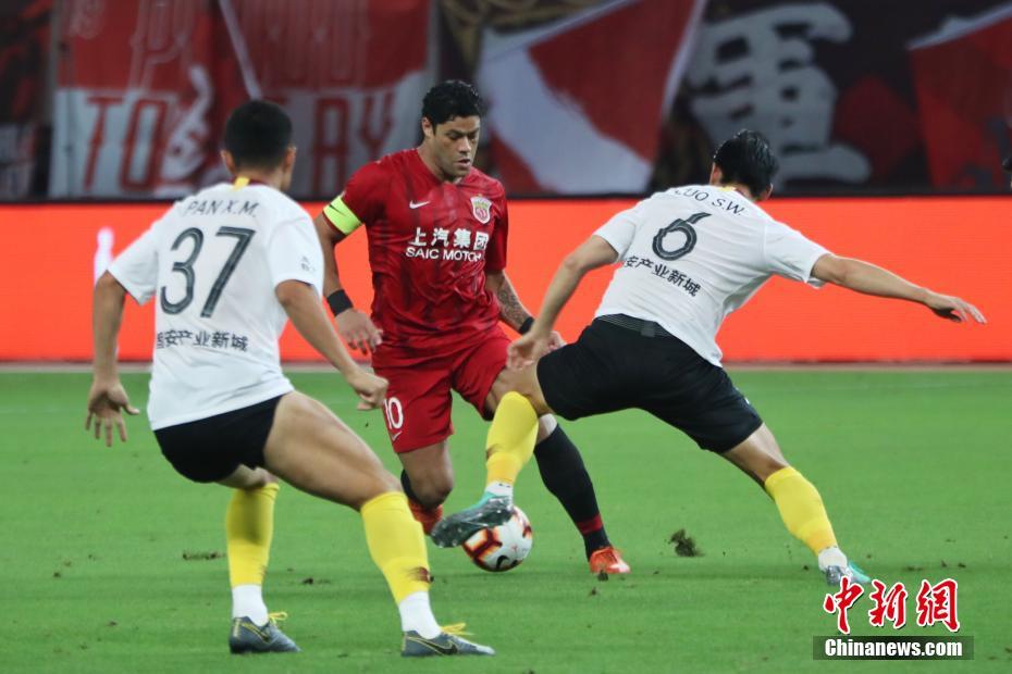 7月17日晚,2019赛季中超联赛第18轮上海上港主场对阵河北华夏幸福的比赛在上海八万人体育场进行。第39分钟,陈彬彬的抽射破门打破僵局;第84分钟,胡尔克推射破门;第86分钟,奥斯卡再下一城。全场比赛结束,上海上港主场3-0击败河北华夏幸福。继续排在积分榜的第3位,与恒大相同积分继续紧追国安,华夏则是继续排在第12位。图为“绿巨人”胡尔克(中间)以一敌二。申海 摄