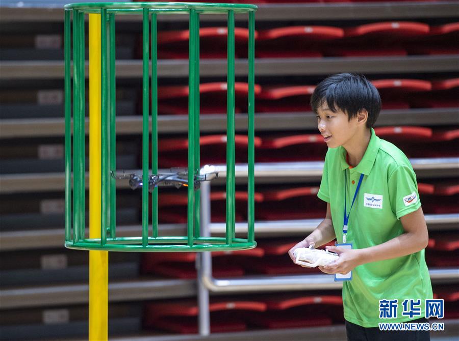 8月4日,选手操纵多轴无人机完成穿越天井规定动作。 第21届“飞向北京·飞向太空”全国青少年航空航天模型教育竞赛活动总决赛8月3日在宁夏银川体育馆开幕。来自北京、上海、宁夏等省市区共49支代表队的选手将在为期三天的比赛中展开角逐。 新华社发(杨植森摄)