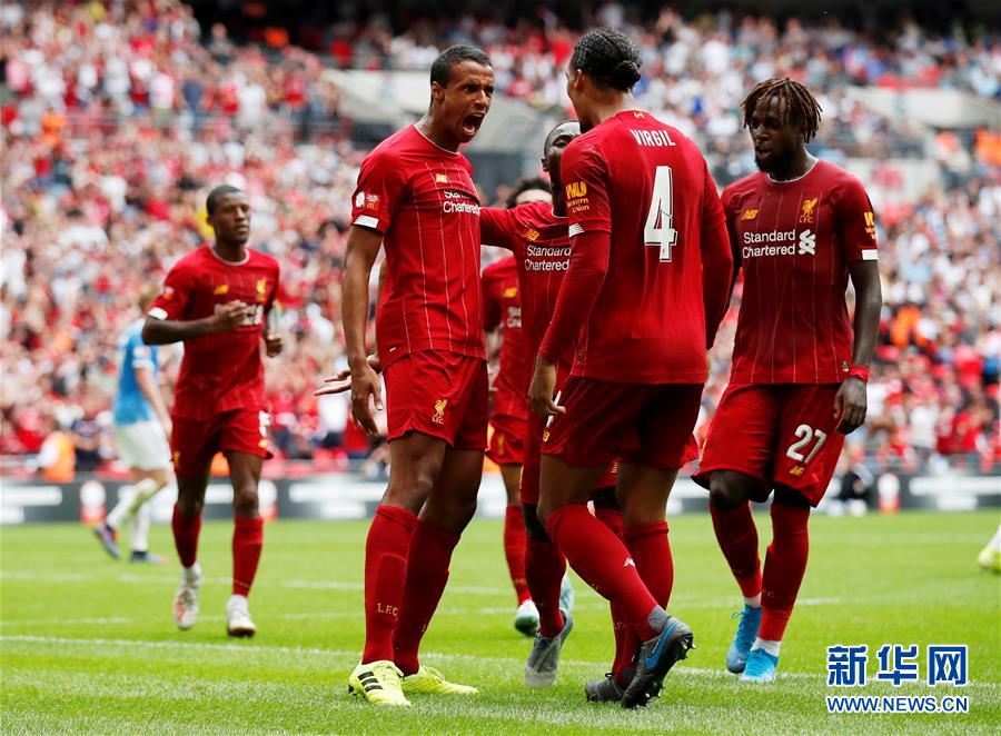 8月4日,利物浦队球员马蒂普(左二)在进球后和队友庆祝。 当日,在2019-2020赛季英格兰社区盾杯足球赛中,曼城队与利物浦队在常规比赛时间内战成1比1平,经过点球大战,曼城队以6比5的总比分战胜利物浦队,获得冠军。 新华社/路透