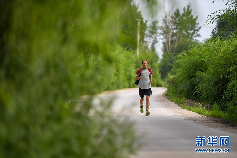 图为奚占玉在吉林省长春市九台区莽卡乡塔库村的乡间小路上跑步(2019年8月5日摄)。 新华社记者张楠摄