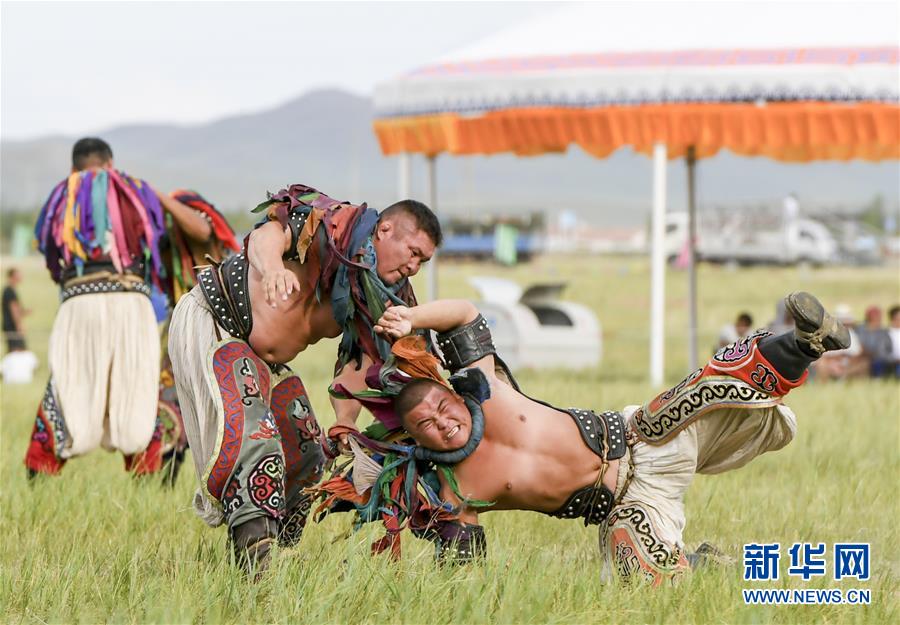 8月13日,选手们在搏克比赛中对决。 当日,“吉祥草原·锡林郭勒”搏克超级联赛总决赛在内蒙古锡林郭勒盟东乌珠穆沁旗拉开帷幕,来自全区12个盟市的256名优秀搏克手披挂上阵、竞相角逐,向观众展示了具有浓郁民族特色的蒙古式摔跤——搏克。 新华社记者彭源摄