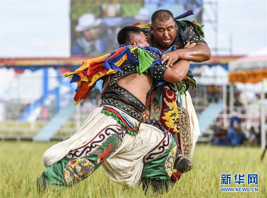 8月13日,两名选手在搏克比赛中对决。 当日,“吉祥草原·锡林郭勒”搏克超级联赛总决赛在内蒙古锡林郭勒盟东乌珠穆沁旗拉开帷幕,来自全区12个盟市的256名优秀搏克手披挂上阵、竞相角逐,向观众展示了具有浓郁民族特色的蒙古式摔跤——搏克。 新华社记者彭源摄