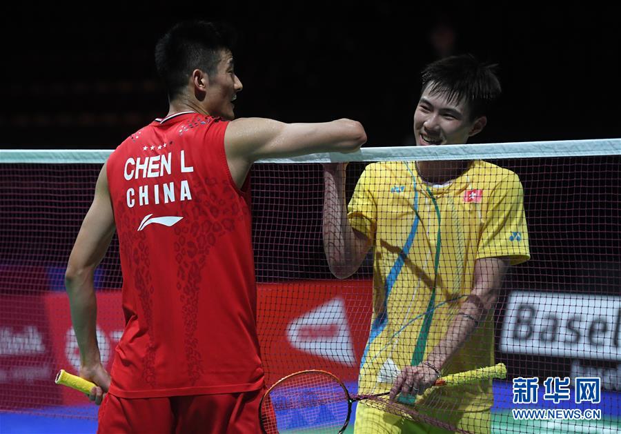 8月21日,中国选手谌龙(左)在比赛后与中国香港选手李卓耀致意。 当日,在瑞士巴塞尔举行的2019年世界羽毛球锦标赛男子单打第二轮比赛中,中国选手谌龙以2比0战胜中国香港选手李卓耀,晋级下一轮。 新华社记者李俊东摄